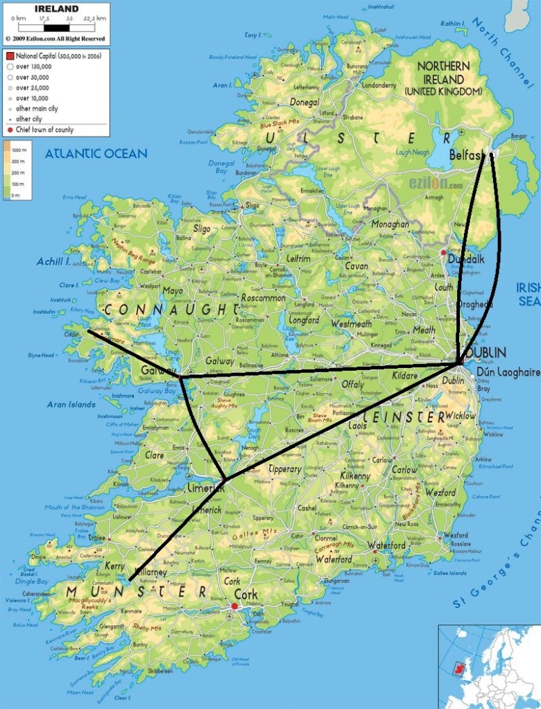 Killarney – Dublin (Bus Eireann) : environ 4h30 avec un changement à Limerick, 308 kms, 25€ par personne.