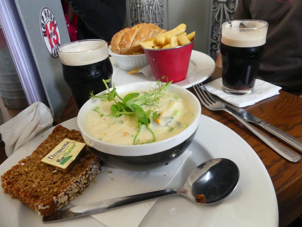 Sinon, autre plat un peu plus léger : la Seafood Chowder. C’est une soupe de poisson un peu épaisse cuisinée avec de la crème et des petits légumes. Servie avec du pain ou Soda Bread et du beurre salé. Un vrai régal !