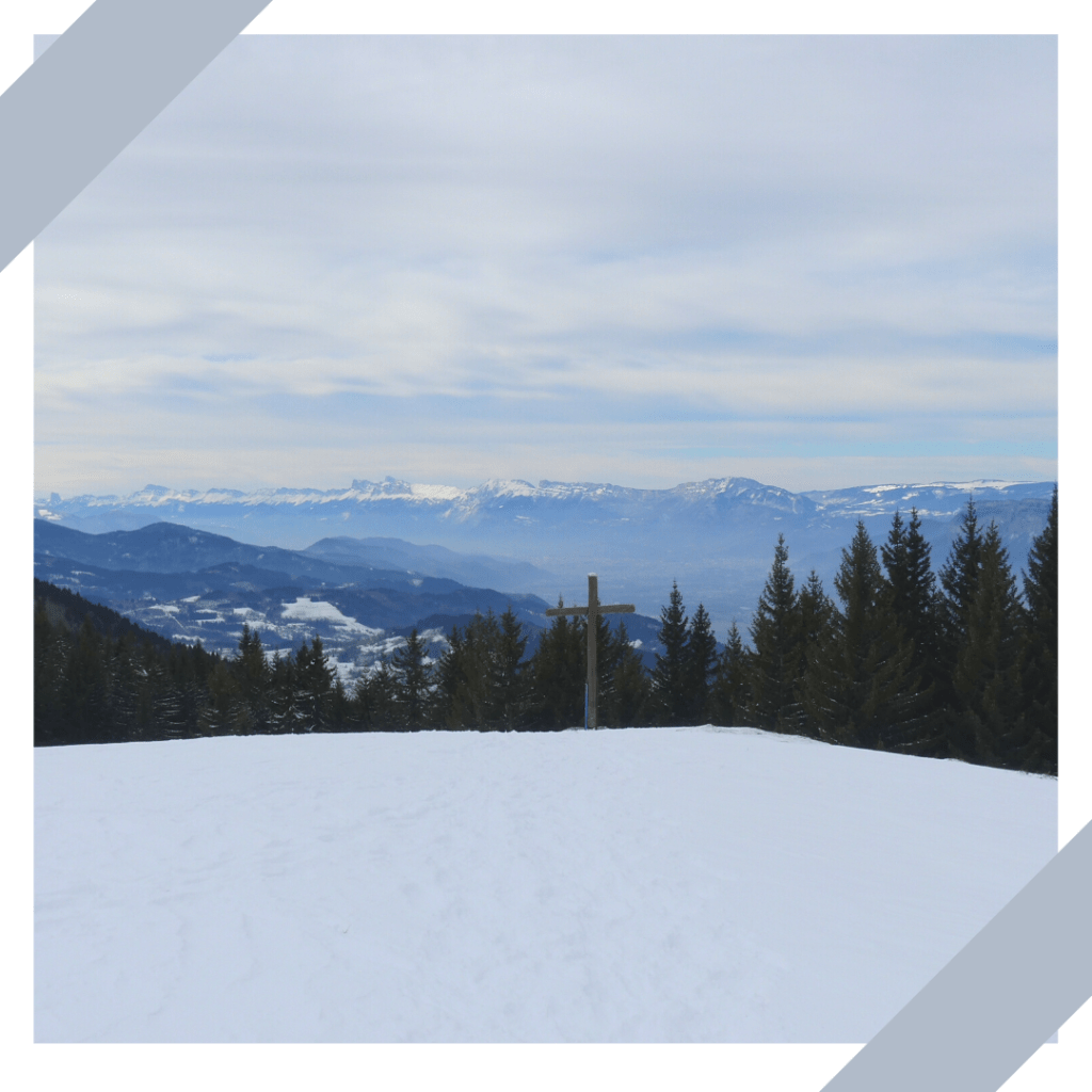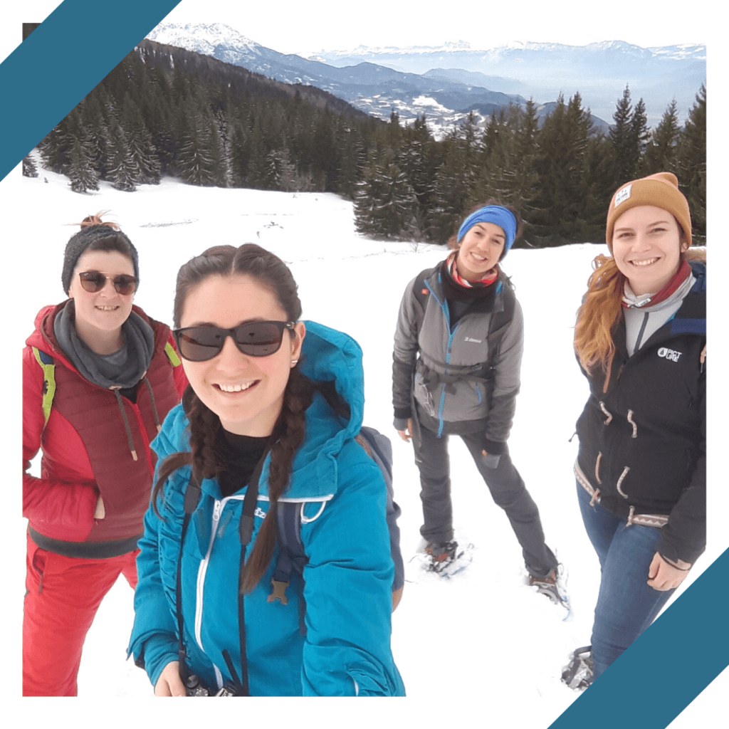 C’est une randonnée en raquette qui demande un peu d’endurance mais le paysage est tellement beau que ça aide. L’avantage de travailler en décalé, c’est que, dans la semaine, les chemins de randonnée sont vides. On a beaucoup aimé profiter de la neige fraîche, du soleil et d’un bon moment entre copines.