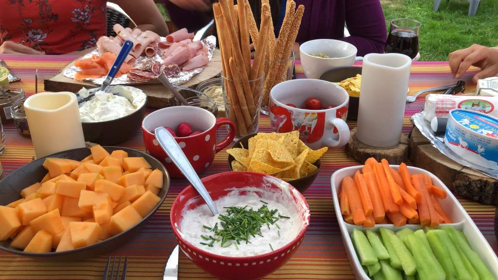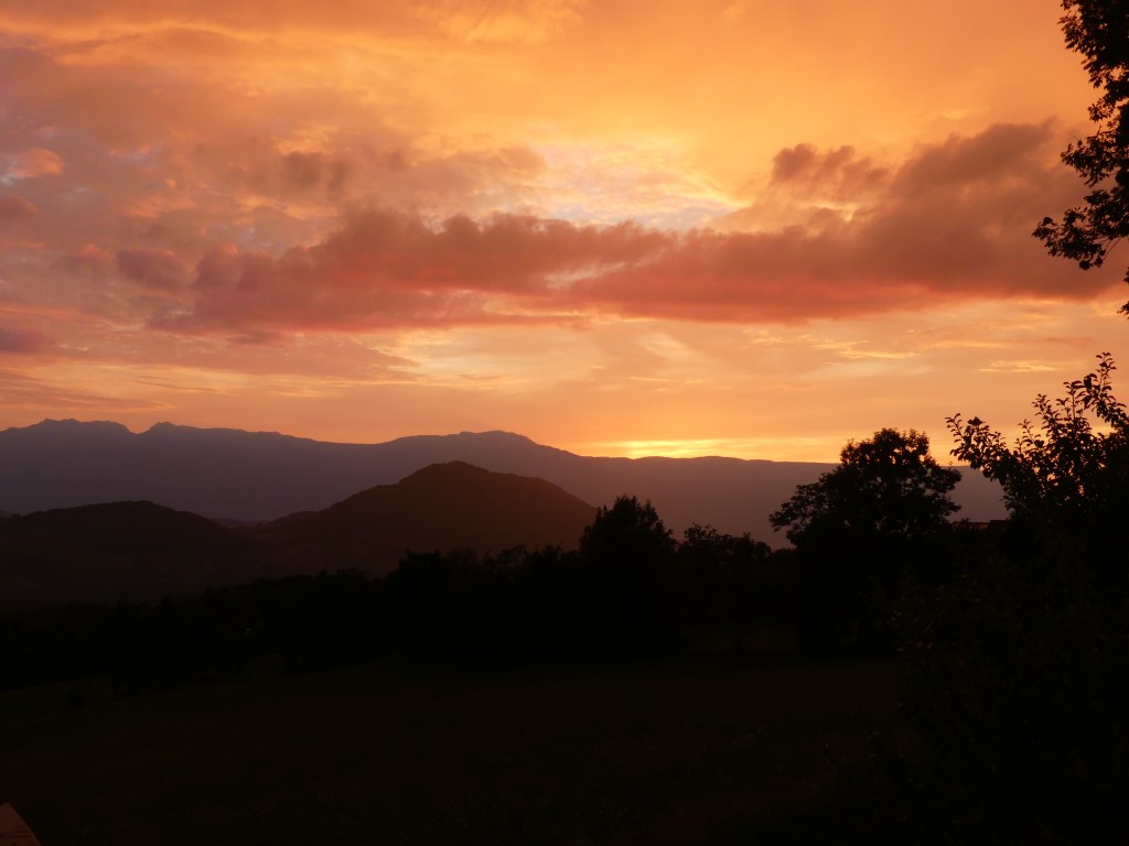 Mais je m’égare, revenons à mon bain à remous ! Nous avons papoté une bonne partie de l’après-midi jusqu’à ce que les autres convives arrivent à leur tour. Tout le monde a fait connaissance autour d’un bel apéro dînatoire concocté par Manon, bien à l’abri dans la yourte, alors qu’il pleuvait dehors. Nous avons assisté à un coucher de soleil mémorable entre les gouttes de pluie. Le calme et la douceur de ce moment resteront gravé à jamais. Nous avons évoqué de vieux souvenirs, raconté des moments partagés et surtout, nous avons bien ri. Nous avons aussi profité du jacuzzi, de la chaleur de l’eau dans la fraicheur de l’air du soir.