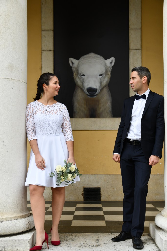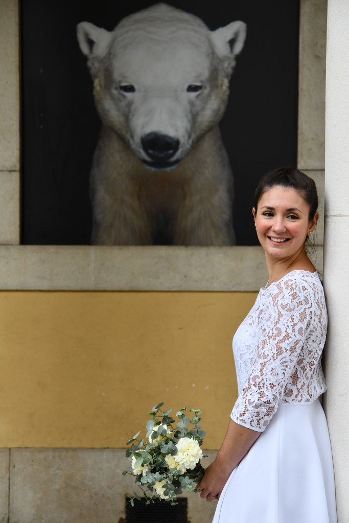 La quête de cette robe a été plus complexe que pour celle de l’église. J’ai changé mille fois d’avis : pantalon, tutu, combinaison… Au final, Emilie a déniché celle-ci sur le portant soldé de la boutique. La taille allait, le prix aussi, je n’aurais jamais pensé pouvoir me permettre une si belle robe pour mon mariage civil, et pourtant, ce fut le cas !