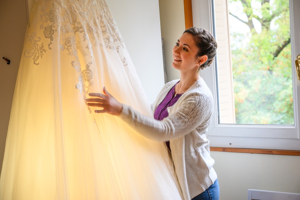 Au dernier moment, j’ai enfilé ma belle robe dans la salle de catéchisme de l’église. Encore une chose qui n’était pas prévue comme cela, mais nous avons pu faire des photos extra avec ce que nous avions sous la main. Ce mariage était sous le signe de l’originalité jusqu’au bout !
