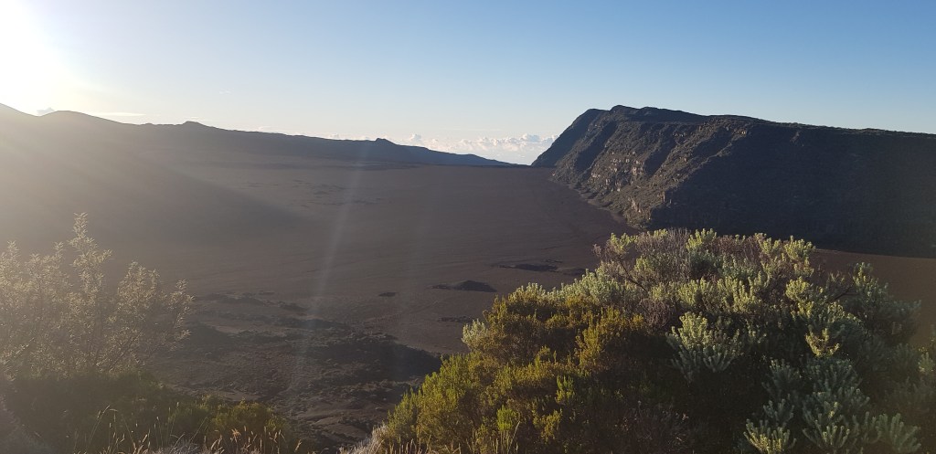 Le soleil se lève doucement et nous offre progressivement un splendide paysage à mesure que la route du Volcan se déroule nous nos pieds. D’abord, les pâturages verts et le sentiment d’être sur le plateau du Vercors, chez nous. Au loin, les sommets des cirques de l’île qui rougeoient au soleil levant. Puis, les forêts profondes d’épineux. Et soudain, au détour d’un virage, la Plaine des Sables et son paysage lunaire impressionnant. Petit à petit, le soleil réchauffe ce paysage désertique et la route goudronnée laisse place à une piste de terre rouge, pleine de nids de poule. On avance doucement, admiratifs de ce paysage au petit matin.