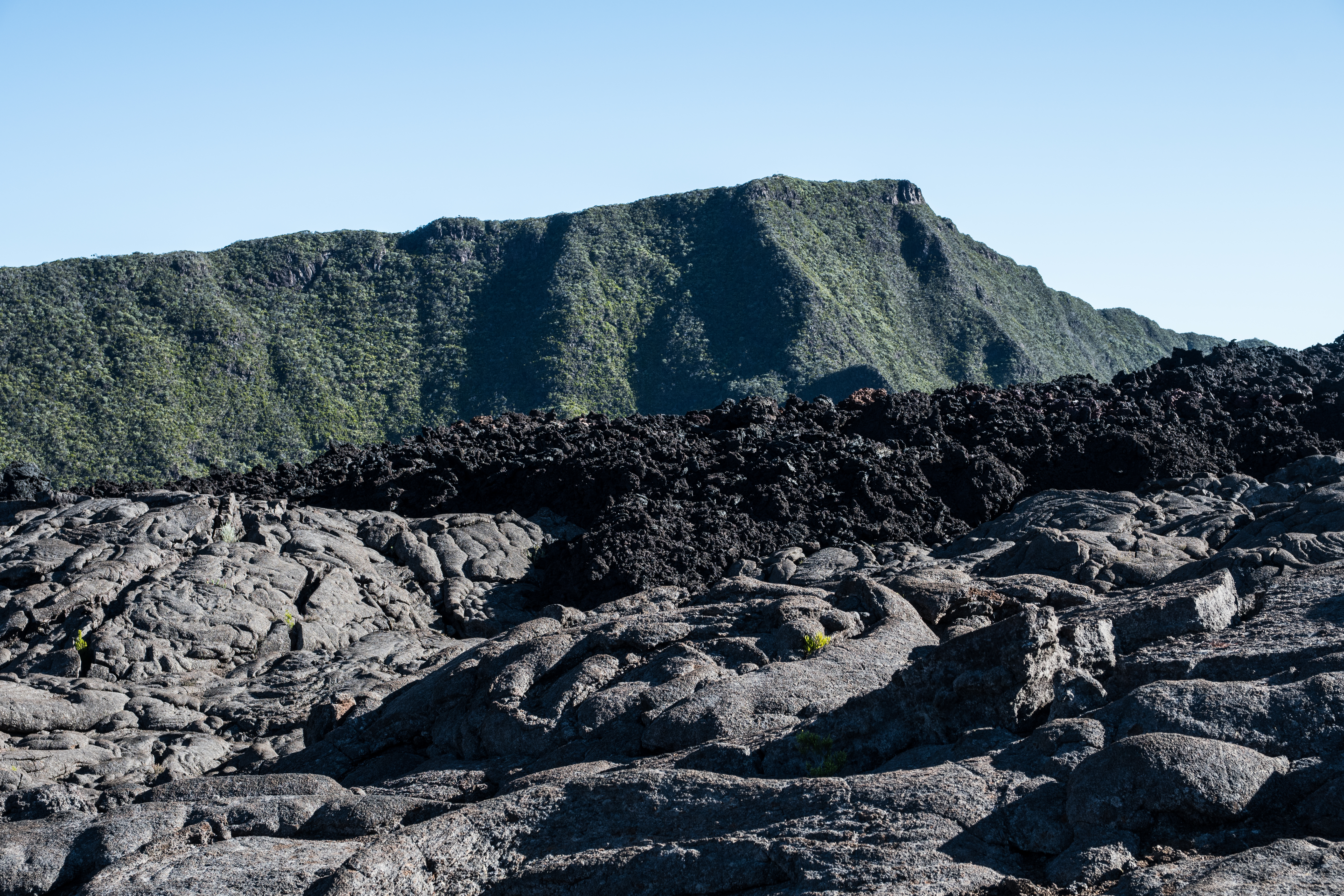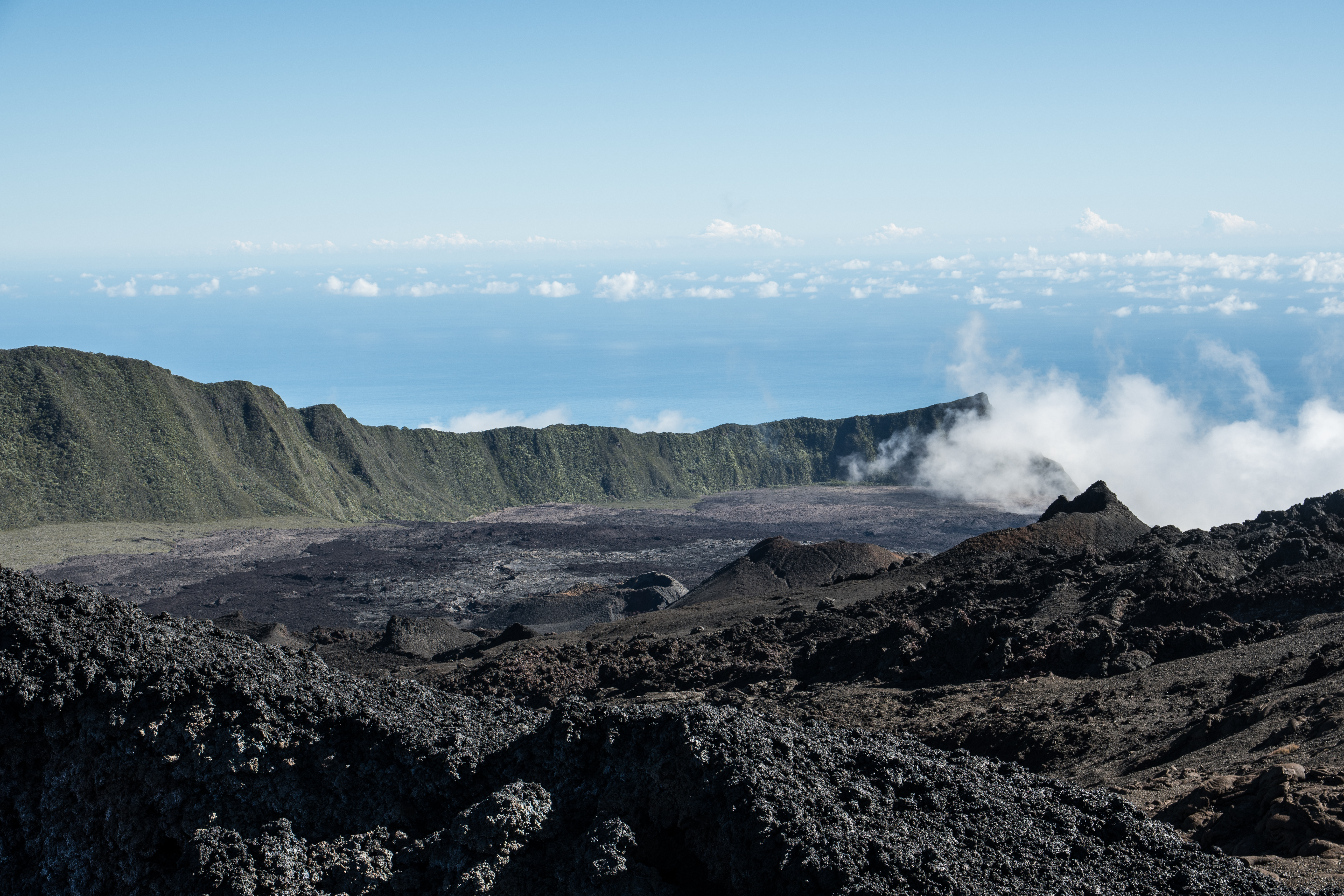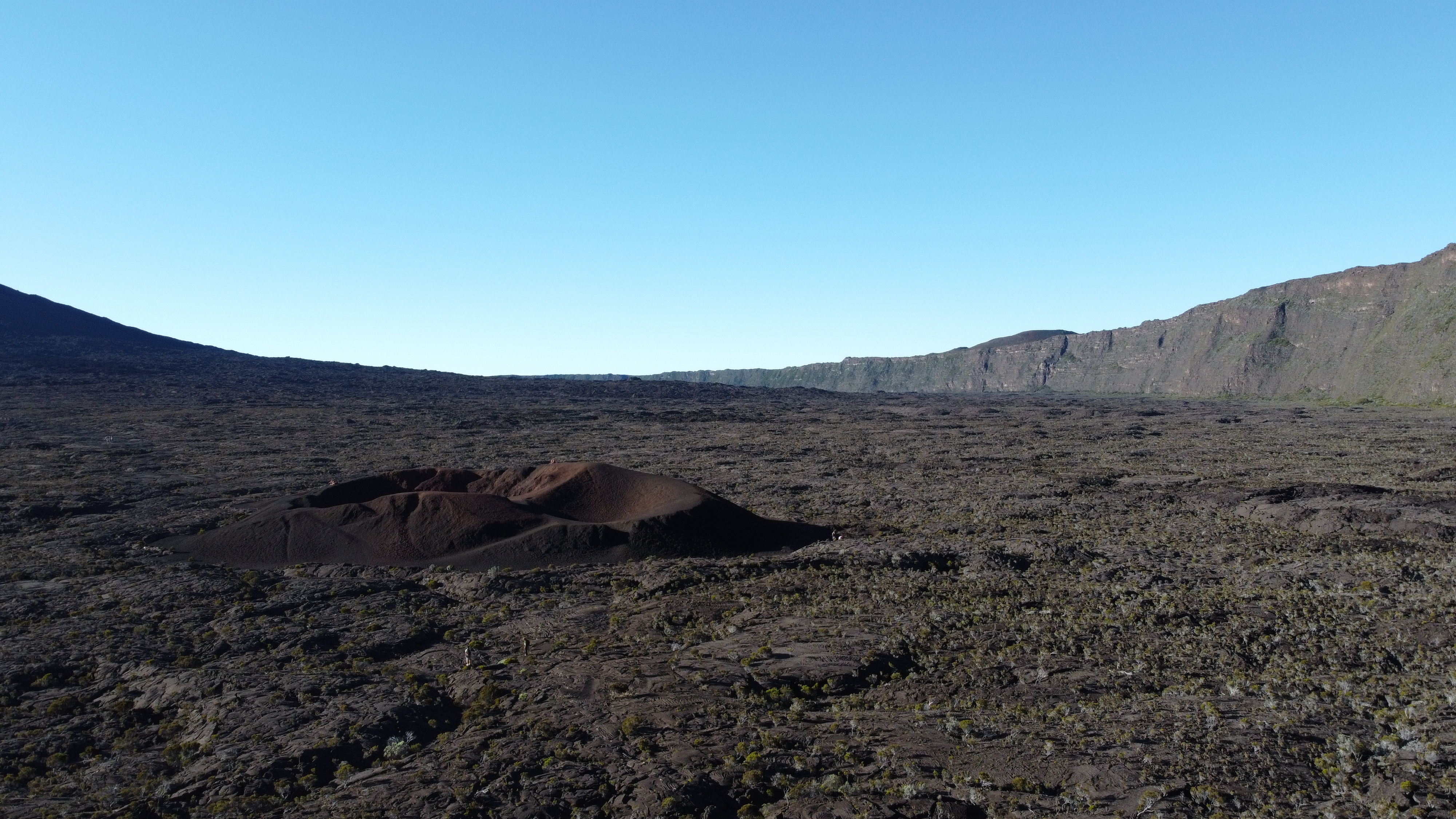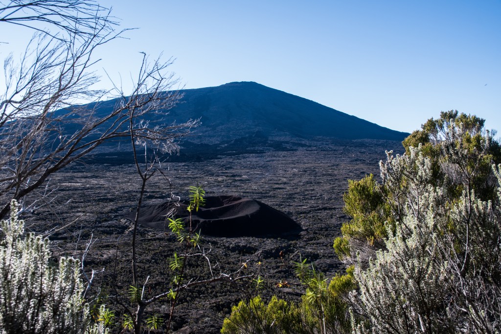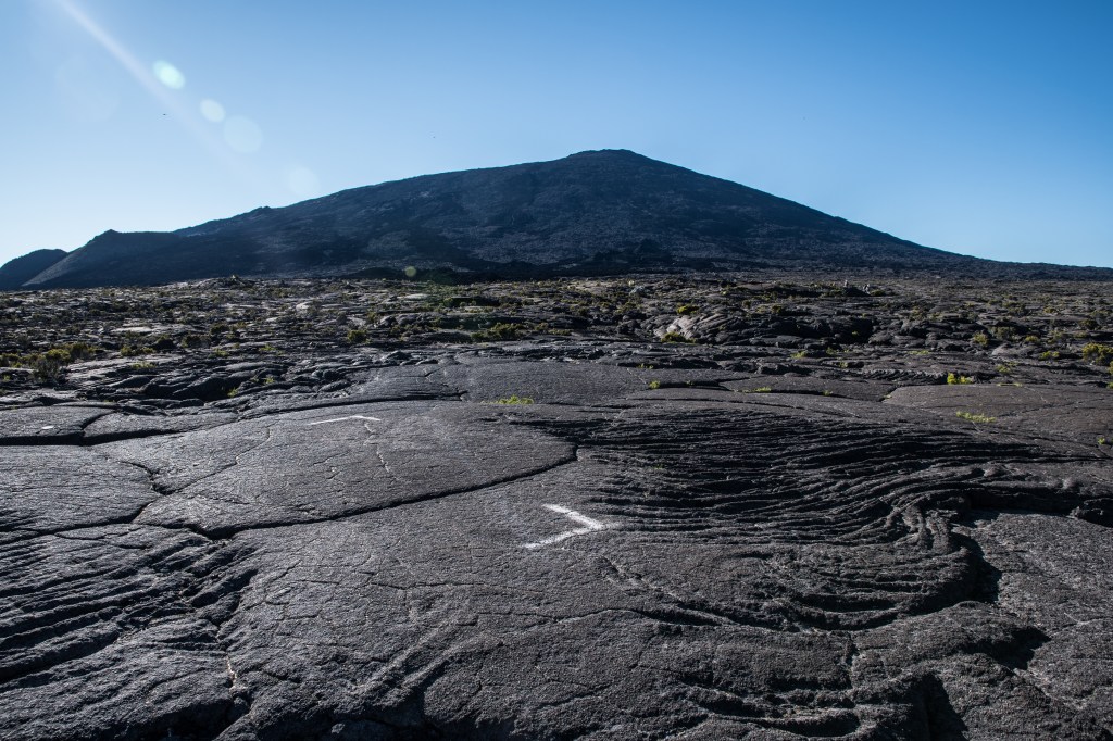 Tout d’abord, on descend depuis le pas de Bellecombe jusqu’à l’enclos Fouqué, un plateau en forme de fer à cheval où un premier petit piton le Formica Leo, nous attend. Ensuite, on traverse le plateau en marchant sur les coulées de laves fossilisées depuis des siècles mais entourés par des coulées bien plus récentes, instables et sombres. Le sol n’est pas facile, pas très plat mais c’est encore faisable.