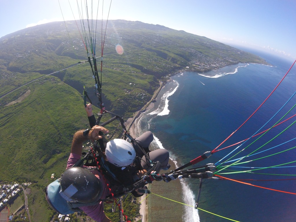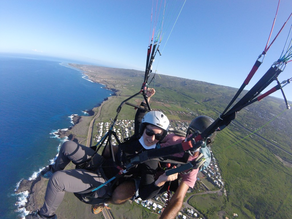Nous avions aussi très envie de faire un baptême de parapente depuis des années. Il a fallu que nous soyons à l’autre bout du monde pour sauter le pas (un comble pour des grenoblois!). Nous avons sauté avec les moniteurs de Air Lagon à St Leu. Nous avons choisi le saut Panoramique qui part de 1600m très tôt le matin pour pouvoir profiter de la fraicheur. Nous avons survolés la forêt primaire des hauts de St Leu avant de voler au dessus du lagon. J’ai même eu la chance d’apercevoir une tortue depuis les airs. Et nous avons atterri sur la plage, non sans gouter à quelques figures aériennes avant ;)
